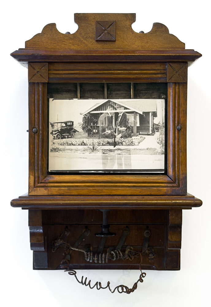A vintage double-exposed photograph of two men and their home has been placed inside an antique annunciator, a device once used to discretely signal unseen servants from other rooms in the house. The two men seem to appear and vanish within the same emulsion, present and gone in the same breath. They are a truth that could be lived but never publicly announced. They are there. They are not there. But no one outside their home is supposed to know the truth.